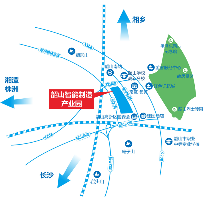 (鳥瞰圖) 三、項(xiàng)目優(yōu)勢 1. 戰(zhàn)略升級 煥新產(chǎn)城融合格局 韶山“十四五”規(guī)劃提出打造高新技術(shù)產(chǎn)業(yè)制造基地,項(xiàng)目作為韶山首個“飛地園區(qū)”,將在踐行強(qiáng)省會戰(zhàn)略中充當(dāng)好排頭兵,助力打造成為長株潭融城,產(chǎn)業(yè)同興共建的樣板,加快產(chǎn)業(yè)集聚,強(qiáng)化產(chǎn)業(yè)配套,助推制造業(yè)高質(zhì)量發(fā)展。 2.領(lǐng)先配套 打造宜居宜業(yè)勝地 韶山市中心城區(qū)劃分為三大組團(tuán),項(xiàng)目處于清溪城區(qū)和高鐵新城的中間位置,優(yōu)勢得天獨(dú)厚,是前往韶山旅游區(qū)的必經(jīng)之路。目前區(qū)域內(nèi)已聚集品質(zhì)住宅、建國酒店,韶山學(xué)校(長郡校區(qū))等優(yōu)質(zhì)配套,規(guī)劃有高新小學(xué)、石忠公園、荷葉塘公園、八畝沖公園等等,集住宅、產(chǎn)業(yè)、商業(yè)、生態(tài)、教育于一體,全力打造宜居宜業(yè)新樣板。 3.立體交通 賦能城市新發(fā)展 項(xiàng)目位于韶山旅游主干道東方紅路兩廂,東方紅路也是前往韶山旅游區(qū)的必經(jīng)之路。距高鐵韶山南站約1.0km、韶山高速約1.0km,30分鐘可直達(dá)湘潭市區(qū),40分鐘可抵達(dá)省會長沙。省道S208三面環(huán)繞園區(qū),穿區(qū)而過的韶山高速串聯(lián)起京珠高速,上瑞高速,與滬昆高鐵構(gòu)成了便捷交通網(wǎng),構(gòu)成長株潭城市群1小時(shí)和北上廣深4小時(shí)經(jīng)濟(jì)圈,為項(xiàng)目發(fā)展提供了強(qiáng)勁動力。 4.政策紅利 助力企業(yè)強(qiáng)勢騰飛 韶山市委、市政府出臺了《韶山市促進(jìn)產(chǎn)業(yè)發(fā)展和招商引資的若干意見》,韶山高新區(qū)在落實(shí)上級政策的基礎(chǔ)上,針對各類項(xiàng)目引進(jìn)、人才激勵、創(chuàng)業(yè)補(bǔ)貼、稅收獎補(bǔ)等方面再制定優(yōu)惠政策,并在專項(xiàng)資金爭取、項(xiàng)目申報(bào)等方面給予支持。 5.德式精工 空間靈活高利用 德式工業(yè)風(fēng)格,精工雕筑,以國際標(biāo)準(zhǔn)打造。通過有層次的空間營造來滿足企業(yè)差異化的購置需求,規(guī)劃有高層廠房、獨(dú)棟廠房、標(biāo)準(zhǔn)廠房和多層廠房,200-20000㎡置業(yè)空間,集生產(chǎn)、辦公、研發(fā)、倉儲、展示等功能??勺杂山M合,實(shí)用性強(qiáng),產(chǎn)權(quán)可分割。 四、項(xiàng)目區(qū)位圖