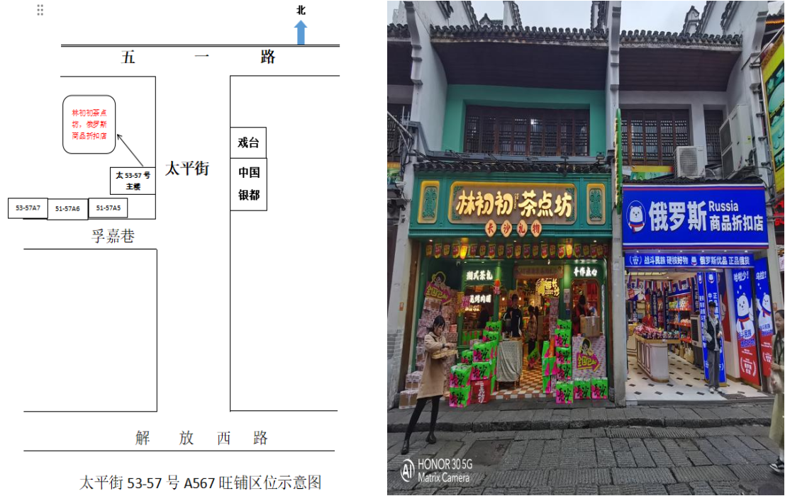 該商鋪位于長(zhǎng)沙市天心區(qū)太平街,其中53-57號(hào)主樓位于主街,共三層;51-57號(hào)(A5、A6、A7)位于支巷,共一層。商鋪按整體招商,建筑面積(即簽約面積)為831㎡。