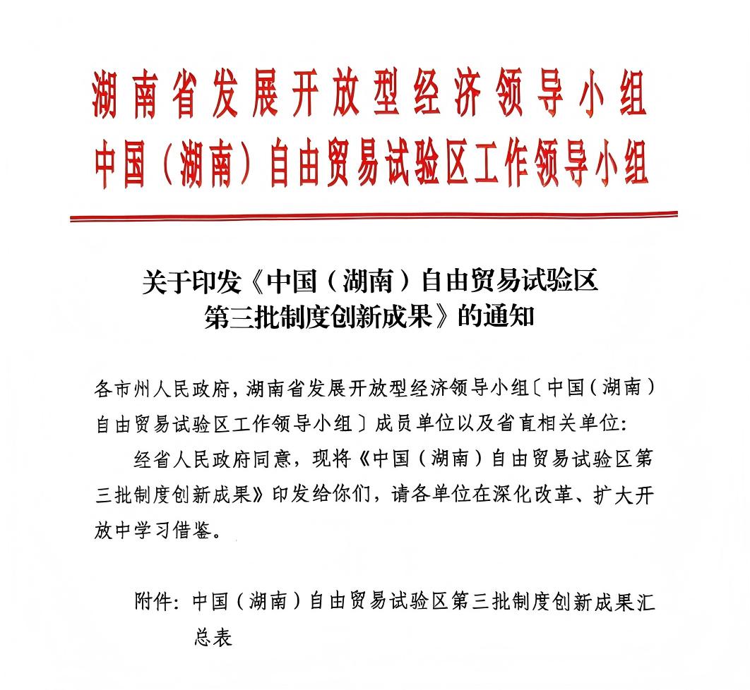 2025年,湖南省發(fā)展開放型經(jīng)濟領(lǐng)導小組、中國(湖南)自由貿(mào)易試驗區(qū)工作領(lǐng)導小組印發(fā)通知,發(fā)布了《中國(湖南)自由貿(mào)易試驗區(qū)第三批制度創(chuàng)新成果》,由省法院、省發(fā)改委、省司法廳牽頭指導,中國(湖南)自由貿(mào)易試驗區(qū)長沙片區(qū)、長沙中院、長沙市發(fā)改委聯(lián)合推動并選定長沙聯(lián)合產(chǎn)權(quán)交易所組織實施的“工程機械法務(wù)機快速處置新模式”入選該批制度創(chuàng)新成果,首創(chuàng)性為“全國首創(chuàng)”。